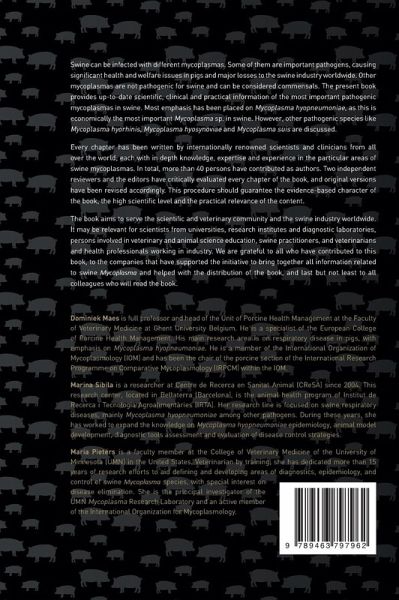 Swine can be infected with different mycoplasmas. Some of them are important pathogens, causing significant health and welfare issues in pigs and major losses to the swine industry worldwide. Other mycoplasmas are not pathogenic for swine and can be considered commensals. The present book provides up-to-date scientific, clinical and practical information of the most important pathogenic mycoplasmas in swine. Most emphasis has been placed on Mycoplasma hyopneumoniae, as this is economically the most important Mycoplasma sp. in swine. However, other pathogenic species like Mycoplasma hyorhinis, Mycoplasma hyosynoviae and Mycoplasma suis are discussed. Every chapter has been written by internationally renowned scientists and clinicians from all over the world; each with in depth knowledge, expertise and experience in the particular areas of swine mycoplasmas. In total, more than 40 persons have contributed as authors. Two independent reviewers and the editors have critically evaluated every chapter of the book, and original versions have been revised accordingly. This procedure should guarantee the evidence-based character of the book, the high scientific level and the practical relevance of the content. The book aims to serve the scientific and veterinary community and the swine industry worldwide. It may be relevant for scientists from universities, research institutes and diagnostic laboratories, persons involved in veterinary and animal science education, swine practitioners, and veterinarians and health professionals working in industry. We are grateful to all who have contributed to this book, to the companies that have supported the initiative to bring together all information related to swine Mycoplasma and helped with the distribution of the book, and last but not least to all colleagues who will read the book.