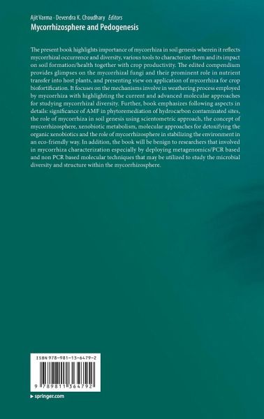 The present book highlights importance of mycorrhiza in soil genesis wherein it reflects mycorrhizal occurrence and diversity, various tools to characterize them and its impact on soil formation/health together with crop productivity. The edited compendium provides glimpses on the mycorrhizal fungi and their prominent role in nutrient transfer into host plants, and presenting view on application of mycorrhiza for crop biofortification. It focuses on the mechanisms involve in weathering process employed by mycorrhiza with highlighting the current and advanced molecular approaches for studying mycorrhizal diversity. Further, book emphasizes following aspects in details: significance of AMF in phytoremediation of hydrocarbon contaminated sites, the role of mycorrhiza in soil genesis using scientometric approach, the concept of mycorrhizosphere, xenobiotic metabolism, molecular approaches for detoxifying the organic xenobiotics and the role of mycorrhizosphere in stabilizing the environment in an eco-friendly way. In addition, the book will be benign to researchers that involved in mycorrhiza characterization especially by deploying metagenomics/PCR based and non PCR based molecular techniques that may be utilized to study the microbial diversity and structure within the mycorrhizosphere.