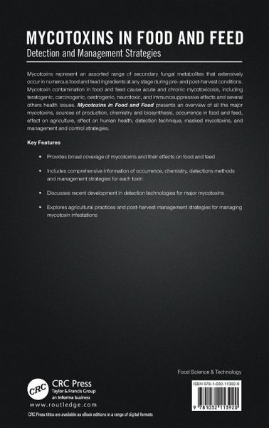 Mycotoxins represent an assorted range of secondary fungal metabolites that extensively occur in numerous food and feed ingredients at any stage during pre- and post-harvest conditions. Mycotoxin contamination in food and feed cause acute and chronic mycotoxicosis, including teratogenic, carcinogenic, oestrogenic, neurotoxic, and immunosuppressive effects and several others health issues. Mycotoxins in Food and Feed presents an overview of all the major mycotoxins, sources of production, chemistry and biosynthesis, occurrence in food and feed, effect on agriculture, effect on human health, detection technique, masked mycotoxins, and management and control strategies.