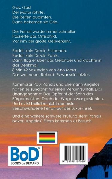 Lediglich die vier Bände Mykonos Love Story 1,2 und 3 Morgenröte über Mykonos sowie 4 Mykonos Speed (Band 5 bis 8) gehören thematisch zusammen, da in ihnen die Beziehung zwischen Kommissar Pandis und seinem Geliebten (und späteren) Ehemann Angelos das Grundthema darstellen.Die ersten zwei Bände, also die reinen Kriminalromane, wurden von Sven M. Schlick verfasst, die Bände 5-8 von Michael Markaris.Die Bände 3 und 4 können aus juristischen Gründen erst zu einem späteren Zeitpunkt erscheinen.Das Mykonos-Sextett besteht aus den Bänden Griechische Brandung und Jenseits von Mykonos sowie der Mykonos Love Story 1, 2, 3 (Morgenröte über Mykonos) und 4 (Mykonos Speed)Jeder Band behandelt einen abgeschlossenen Fall, sodass die Bände nicht in der Reihenfolge gelesen werdenmüssen.Lediglich die vier Bände Mykonos Love Story 1,2 und 3 Morgenröte über Mykonos sowie 4 Mykonos Speed (Band 5 bis 8) gehören thematisch zusammen, da in ihnen die Beziehung zwischen Kommissar Pandis und seinem Geliebten (und späteren) Ehemann Angelos das Grundthema darstellen.Die ersten zwei Bände, also die reinen Kriminalromane, wurden von Sven M. Schlick verfasst, die Bände 5-8 von Michael Markaris.Die Bände 3 und 4 können aus juristischen Gründen erst zu einem späteren Zeitpunkt erscheinen.Am Ende von Mykonos Love Story sind Kommissar Pandis und Angelos gestorben.Der vierte Teil ist das dritte Prequel und behandelt die (glücklichen) Monate vor den tragischen Ereignissen.Während Band 1 auf wahren Begebenheiten beruht, sind die Prequels hinsichtlich der Kriminalfälle natürlich Fiktion.Dort, wo private Momente zwischen Paul Pandis und Angelos geschildert werden, entsprechen die Darstellungen aber ohne Abstriche der Wahrheit.Gas, Gas!Der Motor röhrte.Die Reifen qualmten.Dann bekamen sie Grip.Der Ferrari wurde immer schneller.Passierte das Ortsschild.Vor ihm der große Kreisverkehr.Pedal, kein Druck, Erstaunen.Pedal, kein Druck, Panik.Dann flog er über das Geländer und krachte in das Denkmal.8 Min 42 Sekunden von Ano Mera.Das war neuer Rekord.Es war sein letzter.Kommissar Paul Pandis und Ehemann Angelos halten es zunächst für einen Verkehrsunfall. Das Unangenehme: Das Opfer ist der Sohn des Bürgermeisters. Doch der Wagen war gestohlen. Und esIst beileibe nicht der erste verschwundene Ferrari auf der Luxus-Insel.