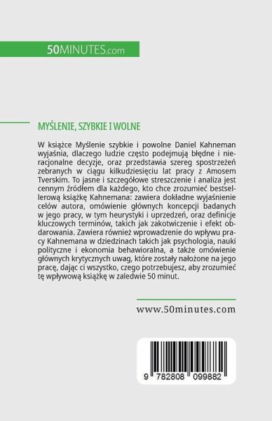 W ksi¿¿ce My¿lenie szybkie i powolne Daniel Kahneman wyjänia, dlaczego ludzie cz¿sto podejmuj¿ b¿¿dne i nieracjonalne decyzje, oraz przedstawia szereg spostrze¿e¿ zebranych w ci¿gu kilkudziesi¿ciu lat pracy z Amosem Tverskim. To jasne i szczegó¿owe streszczenie i analiza jest cennym ¿ród¿em dla kädego, kto chce zrozumie¿ bestsellerow¿ ksi¿¿k¿ Kahnemana: zawiera dok¿adne wyjänienie celów autora, omówienie g¿ównych koncepcji badanych w jego pracy, w tym heurystyki i uprzedze¿, oraz definicje kluczowych terminów, takich jak zakotwiczenie i efekt obdarowania. Zawiera równie¿ wprowadzenie do wp¿ywu pracy Kahnemana w dziedzinach takich jak psychologia, nauki polityczne i ekonomia behawioralna, a tak¿e omówienie g¿ównych krytycznych uwag, które zostäy näöone na jego prac¿, daj¿c ci wszystko, czego potrzebujesz, aby zrozumie¿ t¿ wp¿ywow¿ ksi¿¿k¿ w zaledwie 50 minut. O ksi¿¿ce My¿lenie, szybko i powoli : Thinking, Fast and Slow identyfikuje dwa systemy my¿lowe, okre¿lane jako System 1 i System 2, które rz¿dz¿ tym, jak przetwarzamy informacje i podejmujemy decyzje. S¿ to tytüowe "szybko" i "wolno", które wspó¿dziäaj¿ ze sob¿, pomagaj¿c nam dokonywä wyborów. Ksi¿¿ka bada równie¿ uprzedzenia i b¿¿dy, które prowadz¿ ludzi do dziäania w sposób irracjonalny, ilustrowane studiami przypadków i przyk¿adami z ¿ycia. O Danielu Kahnemanie : Daniel Kahneman jest izraelsko-amerykäskim psychologiem i ekonomist¿. Znany jest przede wszystkim ze swojej wieloletniej wspó¿pracy z psychologiem Amosem Tverskym, z którym przeprowadzi¿ badania nad podejmowaniem decyzji, które przynios¿y mu Nagrod¿ Nobla w dziedzinie nauk ekonomicznych w 2002 roku. Jego badania, a zw¿aszcza wieloletnia wspó¿praca z Richardem Thalerem, laureatem Nagrody Nobla z 2017 roku, odegräy znacz¿c¿ rol¿ w tworzeniu dziedziny ekonomii behawioralnej. Kahneman jest obecnie emerytowanym profesorem psychologii i spraw publicznych na Uniwersytecie Princeton.