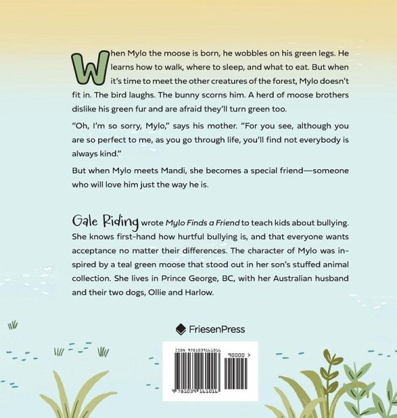 Gale Riding wrote Mylo Finds a Friend to teach kids about bullying. She knows first-hand how hurtful bullying is, and that everyone wants acceptance no matter their differences. The character of Mylo was inspired by a teal green moose that stood out in her son's stuffed animal collection.
