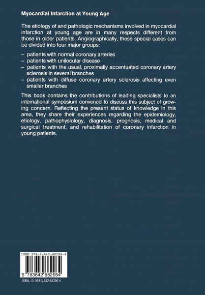 Session 1 Epidemiology and Risk Factors.- The Epidemiology of Acute Myocardial Infarction in Young Age Groups.- Myocardial Infarction in Young Men in the Heidelberg Register Area.- Coronary Artery Disease in Young Adults Under 35 Years Old: Risk Factors (Swiss Survey).- Myocardial Infarction Among Men Below Age 40 in Göteborg.- Myocardial Infarction at Young Age: Risk Factors and Natural History.- Role of Family History in Coronary Heart Disease at Young Age.- Session 2 Angiographic Findings and Prognosis.- Coronary Arteriographic Findings in Younger Survivors of Acute Myocardial Infarction Including Those with Normal Coronary Arteries.- Angiographic Findings in Postinfarction Patients Under the Age of 35.- Coronary Angiographic Findings and Risk Factors in Postinfarction Patients Under the Age of 40.- Evolution of Ventricular Function in Young Patients with Myocardial Infarction and Normal Coronary Arteries: Advantage of Isotopic Methods.- Prognosis of Coronary Heart Disease and Progression of Coronary Arteriosclerosis in Postinfarction Patients Under the Age of 40.- Session 3 Pathology and Pathomechanisms I.- Myocardial Infarction in Patients Under the Age of 40: Autopsy Findings.- Comparison of Luminal Narrowing by Atherosclerotic Plaques in Young and Very Old Necropsy Patients with Fatal Coronary Events.- Coexistence of Vigorous Exercise and Heavy Smoking in Triggering Acute Myocardial Infarction in Men Under 35 Years - Fact or Fiction?.- Myocardial Infarction at Young Age During High Physical Exercise.- Acute Myocardial Infarction in Young Women: Evidence for Spontaneous Lysis of a Coronary Thrombus.- Session 4 Pathology and Pathomechanisms II.- Major Role of Coronary Spasm in the Pathogenesis of Myocardial Infarction at Young Age.- Myocardial Infarction andNormal Coronary Arteries: Possible Role of Spasm.- Relationship of Age and Serum Cholesterol to Platelet Survival Time in Men with Coronary Artery Disease.- Risk Factors in Patients with Myocardial Infarction Under the Age of 40.- Session 5 Therapy I.- Mechanism and Prevention Possibilities in Coronary Thrombosis.- Intracoronary Fibrinolysis in Acute Myocardial Infarction in Young Patients.- Beta-Blocker Treatment in the Chronic Phase of Myocardial Infarction in Young Age Groups.- Prevention of Sudden Death in Young Patients: The Role of Antiarrhythmic Therapy.- Occupational Situation in Postinfarction Patients Under the Age of 40.- Psychological and Vocational Aspects in Postinfarction Patients Below the Age of 40.- Risk Reduction and Coronary Progression and Regression in Humans.- Session 6 Therapy II (Surgery).- Myocardial Revascularization in Patients Under 40 Years of Age.- Long-Term Results of Ventricular Aneurysm Repair in Patients Under 45 Years of Age.- Surgical Treatment of Chronic Ventricular Tachycardia After Myocardial Infarction.