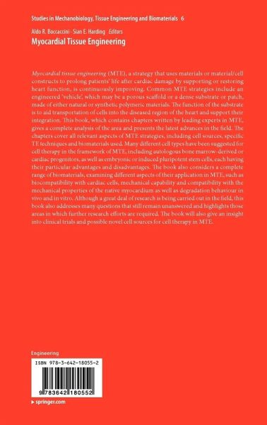 Myocardial tissue engineering (MTE), a concept that intends to prolong patients' life after cardiac damage by supporting or restoring heart function, is continuously improving. Common MTE strategies include an engineered 'vehicle', which may be a porous scaffold or a dense substrate or patch, made of either natural or synthetic polymeric materials. The function of the substrate is to aid transportation of cells into the diseased region of the heart and support their integration. This book, which contains chapters written by leading experts in MTE, gives a complete analysis of the area and presents the latest advances in the field. The chapters cover all relevant aspects of MTE strategies, including cell sources, specific TE techniques and biomaterials used. Many different cell types have been suggested for cell therapy in the framework of MTE, including autologous bone marrow-derived or cardiac progenitors, as well as embryonic or induced pluripotent stem cells, each having theirparticular advantages and disadvantages. The book covers a complete range of biomaterials, examining different aspects of their application in MTE, such as biocompatibility with cardiac cells, mechanical capability and compatibility with the mechanical properties of the native myocardium as well as degradation behaviour in vivo and in vitro. Although a great deal of research is being carried out in the field, this book also addresses many questions that still remain unanswered and highlights those areas in which further research efforts are required. The book will also give an insight into clinical trials and possible novel cell sources for cell therapy in MTE.