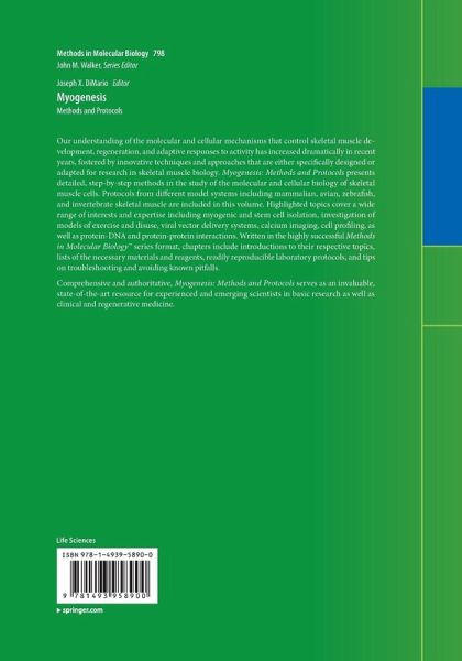 Our understanding of the molecular and cellular mechanisms that control skeletal muscle development, regeneration, and adaptive responses to activity has increased dramatically in recent years, fostered by innovative techniques and approaches that are either specifically designed or adapted for research in skeletal muscle biology. Myogenesis: Methods and Protocols presents detailed, step-by-step methods in the study of the molecular and cellular biology of skeletal muscle cells. Protocols from different model systems including mammalian, avian, zebrafish, and invertebrate skeletal muscle are included in this volume. Highlighted topics cover a wide range of interests and expertise including myogenic and stem cell isolation, investigation of models of exercise and disuse, viral vector delivery systems, calcium imaging, cell profiling, as well as protein-DNA and protein-protein interactions. Written in the highly successful Methods in Molecular Biology(TM) series format, chapters include introductions to their respective topics, lists of the necessary materials and reagents, readily reproducible laboratory protocols, and tips on troubleshooting and avoiding known pitfalls.