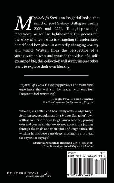 Myriad of a Soul is an insightful look at the mind of poet Sydney Gallagher during 2020 and 2021. Thought-provoking, meditative, as well as lighthearted, the poems tell the story of a teen who is struggling to understand herself and her place in a rapidly changing world and society. Written from the perspective of a young woman who understands the value of a self-examined life, this collection will surely inspire other teens to explore their own identity.