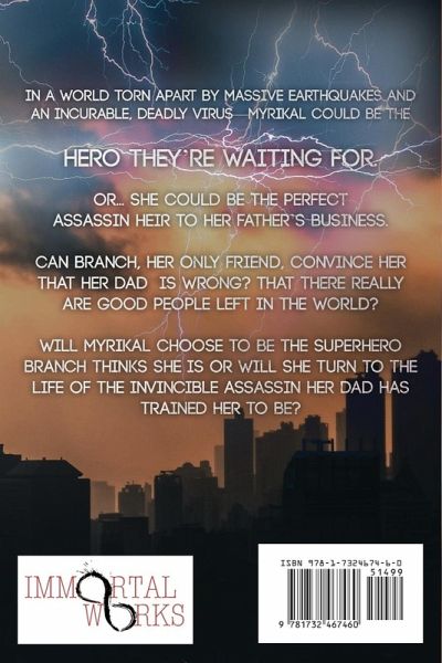 In a world torn apart by massive earthquakes and an incurable, deadly virus—Myrikal could be the hero they’re waiting for. Or… she could be the perfect assassin heir to her father’s business. Can Branch, her only friend, convince her that her dad is wrong? That there really are good people left in the world? Will Myrikal choose to be the Superhero Branch thinks she is or will she turn to the life of the invincible assassin her dad has trained her to be?