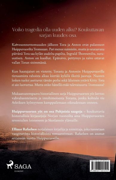 Voiko tragedia olla uuden alku? Koukuttava sarja jatkuu kuudennessa osassa.Kaivosonnettomuuden jälkeen Tora ja Anton ovat palanneet Huippuvuorilta Tromssaan. Pari menee naimisiin, mutta jo seuraavana päivänä Tora saa kylän uudelta papilta, Ingvald Thoresenilta, suru-uutisen. Anton on kuollut. Epätoivo, pettymys ja raivo ottavat vallan Toran sisimmässä. Kun hautajaiset on vietetty, Torasta ja Antonin Huippuvuorilla tienaamista rahoista alkaa kiertää kylällä ilkeitä juoruja. Nuoren lesken tueksi asettuvat tämän perhe sekä läheinen ystävä Kitty. Tora ei aio luovuttaa. Mutta onko hänellä enää tulevaisuutta Tromssassa?Mukaansatempaava historiallinen sarja Huippuvuorten yöt kertoo vahvaluonteisesta ja intohimoisesta Torasta, jonka kohtalo vie Arktiksen kylmyyteen kamppailemaan oikeudestaan onneen.Huippuvuorten yöt on osa Pohjoisia saagoja - koukuttavia historiallisia kirjasarjoja Norjan vuonoilta aina Huippuvuorten revontulien loisteeseen ja Skotlannin ylämaille.
