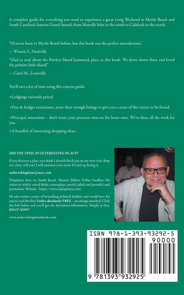 A complete guide for everything you need to experience a great Long Weekend in Myrtle Beach and South Carolina's famous Grand Strand, from Murrells Inlet in the south to Calabash in the north. "I'd never been to Myrtle Beach before, but this book was the perfect introduction." --- Winnie S., Nashville "Glad to read about the Pawleys Island hammock place in this book. We drove down there and loved the pristine little island." --- Carol M., Louisville You'll save a lot of time using this concise guide. =Lodgings variously priced =Fine & budget restaurants, more than enough listings to give you a sense of the variety to be found. =Principal attractions -- don't waste your precious time on the lesser ones. We've done all the work for you. =A handful of interesting shopping ideas.