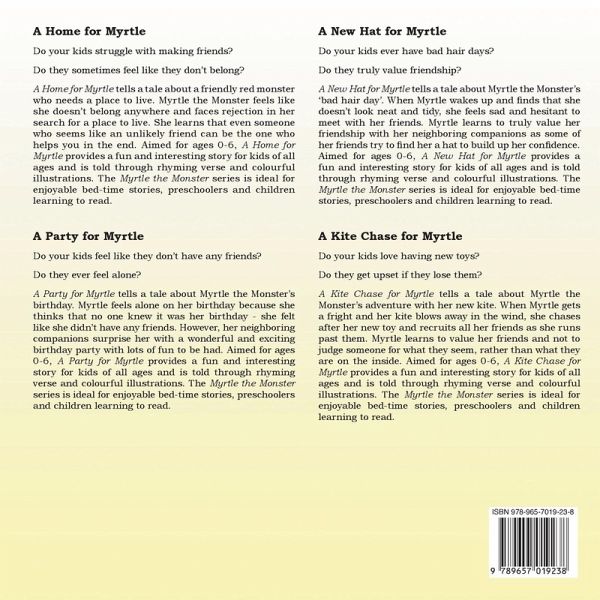 A Home for Myrtle Do your kids struggle with making friends? Do they sometimes feel like they don't belong? A Home for Myrtle tells a tale about a friendly red monster who needs a place to live. Myrtle the Monster feels like she doesn't belong anywhere and faces rejection in her search for a place to live. She learns that even someone who seems like an unlikely friend can be the one who helps you in the end. Aimed for ages 0-6, A Home for Myrtle provides a fun and interesting story for kids of all ages and is told through rhyming verse and colourful illustrations. The Myrtle the Monster series is ideal for enjoyable bed-time stories, preschoolers and children learning to read. A Party for Myrtle Do your kids feel like they don't have any friends? Do they ever feel alone? A Party for Myrtle tells a tale about Myrtle the Monster's birthday. Myrtle feels alone on her birthday because she thinks that no one knew it was her birthday - she felt like she didn't have any friends. However, her neighboring companions surprise her with a wonderful and exciting birthday party with lots of fun to be had. Aimed for ages 0-6, A Party for Myrtle provides a fun and interesting story for kids of all ages and is told through rhyming verse and colourful illustrations. The Myrtle the Monster series is ideal for enjoyable bed-time stories, preschoolers and children learning to read. A New Hat for Myrtle Do your kids ever have bad hair days? Do they truly value friendship? A New Hat for Myrtle tells a tale about Myrtle the Monster's 'bad hair day'. When Myrtle wakes up and finds that she doesn't look neat and tidy, she feels sad and hesitant to meet with her friends. Myrtle learns to truly value her friendship with her neighboring companions as some of her friends try to find her a hat to build up her confidence. Aimed for ages 0-6, A New Hat for Myrtle provides a fun and interesting story for kids of all ages and is told through rhyming verse and colourful illustrations. The Myrtle the Monster series is ideal for enjoyable bed-time stories, preschoolers and children learning to read. A Kite Chase for Myrtle Do your kids love having new toys? Do they get upset if they lose them? A Kite Chase for Myrtle tells a tale about Myrtle the Monster's adventure with her new kite. When Myrtle gets a fright and her kite blows away in the wind, she chases after her new toy and recruits all her friends as she runs past them. Myrtle learns to value her friends and not to judge someone for what they seem, rather than what they are on the inside. Aimed for ages 0-6, A Kite Chase for Myrtle provides a fun and interesting story for kids of all ages and is told through rhyming verse and colourful illustrations. The Myrtle the Monster series is ideal for enjoyable bed-time stories, preschoolers and children learning to read.