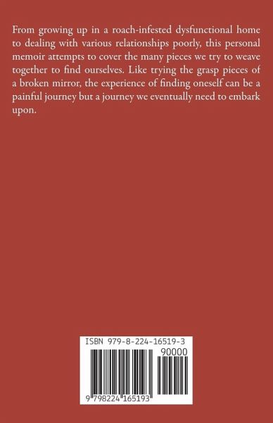From growing up in a roach-infested dysfunctional home to dealing with various relationships poorly, this personal memoir attempts to cover the many pieces we try to weave together to find ourselves. Like trying the grasp pieces of a broken mirror, the experience of finding oneself can be a painful journey but a journey we eventually need to embark upon.
