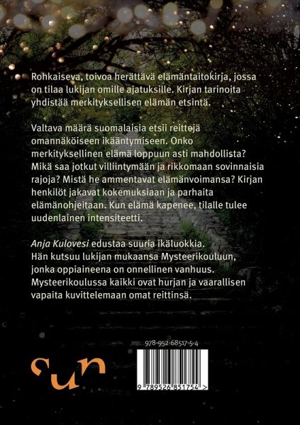 Rohkaiseva, toivoa herättävä elämäntaitokirja, jossa on tilaa lukijan omille ajatuksille. Kirjan tarinoita yhdistää merkityksellisen elämän etsintä. Valtava määrä suomalaisia etsii reittejä omannäköiseen ikääntymiseen. Onko merkityksellinen elämä loppuun asti mahdollista? Mikä saa jotkut villiintymään ja rikkomaan sovinnaisia rajoja? Mistä he ammentavat elämänvoimansa? Kirjan henkilöt jakavat kokemuksiaan ja parhaita elämänohjeitaan. Kun elämä kapenee, tilalle tulee uudenlainen intensiteetti. Mysteerikoulun oppiaineena on onnellinen vanhuus. Mysteerikoulussa kaikki ovat hurjan ja vaarallisen vapaita kuvittelemaan omat parhaat reittinsä.