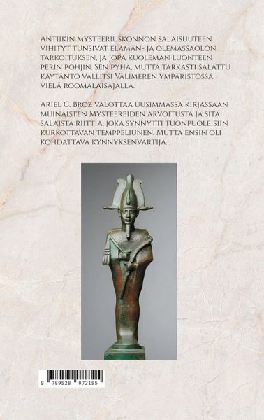 Antiikin mysteeriuskonnon salaisuuteen vihityt tunsivat elämän- ja olemassaolon tarkoituksen, ja jopa kuoleman luonteen perin pohjin. Sen pyhä, mutta tarkasti salattu käytäntö vallitsi Välimeren ympäristössä vielä roomalaisajalla. Ariel C. Broz valottaa uusimmassa kirjassaan muinaisten Mysteereiden arvoitusta ja sitä salaista riittiä, joka synnytti tuonpuoleisiin kurkottavan temppeliunen. Mutta ensin oli kohdattava kynnyksenvartija...