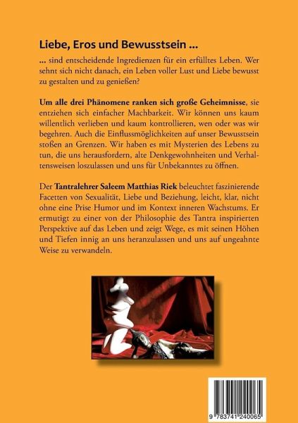 Liebe, Eros und Bewusstsein......sind entscheidende Ingredienzen für ein erfülltes Leben. Wer sehnt sich nicht danach, ein Leben voller Lust und Liebe bewusst zu gestalten und zu genießen?Um alle drei Phänomene ranken sich große Geheimnisse, sie entziehen sich einfacher Machbarkeit. Wir können uns kaum willentlich verlieben und kaum kontrollieren, wen oder was wir begehren. Auch die Einflussmöglichkeiten auf unser Bewusstsein stoßen an Grenzen. Wir haben es mit Mysterien des Lebens zu tun, die uns herausfordern, alte Denkgewohnheiten und Verhaltensweisen loszulassen und uns für Unbekanntes zu öffnen.Der Tantralehrer Saleem Matthias Riek beleuchtet faszinierende Facetten von Sexualität, Liebe und Beziehung, leicht, klar, nicht ohne eine Prise Humor und im Kontext inneren Wachstums. Er ermutigt zu einer von der Philosophie des Tantra inspirierten Perspektive auf das Leben und zeigt Wege, es mit seinen Höhen und Tiefen innig an uns heranzulassen und uns auf ungeahnte Weise zu verwandeln.