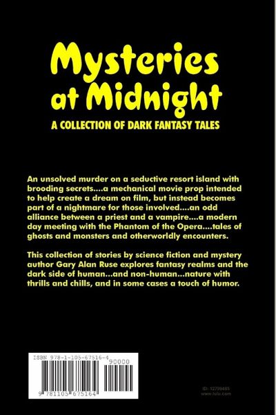 Mysteries at Midnight - A Collection of Dark Fantasy Tales. An unsolved murder on a seductive resort island with brooding secrets....a mechanical movie prop intended to help create a dream on film, but instead becomes part of a nightmare for those involved....an odd alliance between a priest and a vampire....a modern day meeting with the Phantom of the Opera....tales of ghosts and monsters and otherworldly encounters. This collection of stories by science fiction and mystery author Gary Alan Ruse explores fantasy realms and the dark side of human...and non-human...nature with thrills and chills, and in some cases a touch of humor.