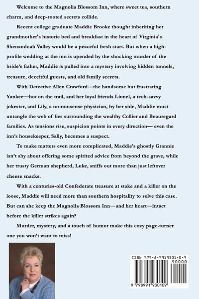 Welcome to the Magnolia Blossom Inn, where sweet tea, southern charm, and deep-rooted secrets collide. Recent college graduate Maddie Brooke thought inheriting her grandmother's historic bed and breakfast at the gateway to Virginia's Shenandoah Valley would be a peaceful endeavor. But when a high-profile wedding at the inn is upended by the shocking murder of the bride's father, Maddie is pulled into a mystery involving hidden tunnels, treasure, deceitful guests, and old family secrets. With Detective Allen Crawford-the handsome but frustrating Yankee-hot on the trail, and her loyal friends Lionel, a tech-savvy jokester, and Lily, a no-nonsense physician, by her side, Maddie must untangle the web of lies surrounding the wealthy Collier and Beauregard families. As tensions rise, suspicion points in every direction. Even the inn's housekeeper, Sally, becomes a suspect. To make matters even more complicated, Maddie's ghostly Grannie isn't shy about offering some spirited advice from beyond the grave, while her trusty German shepherd, Luke, sniffs out more than just leftover cheese snacks. With a centuries-old Confederate treasure at stake and a killer on the loose, Maddie will need more than southern hospitality to solve this case. But can she keep the Magnolia Blossom Inn-and her heart-intact before the killer strikes again? Maddie explores secret tunnels that date back before the Civil War in her search for the truth about the murder and the rumored Confederate treasure. Maddie fights for her life when she falls into the hands of the crazed killers bent on revenge. Murder, mystery, and a touch of humor make this cozy page-turner one you won't want to miss!