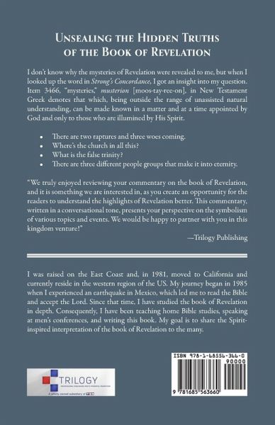 Unsealing the Hidden Truths of the Book of Revelation I don't know why the mysteries of Revelation were revealed to me, but when I looked up the word in Strong's Concordance, I got an insight into my question. Item 3466, "mysteries," musterion [moos-tay-ree-on], in New Testament Greek denotes that which, being outside the range of unassisted natural understanding, can be made known in a matter and at a time appointed by God and only to those who are illumined by His Spirit. * There are two raptures and three woes coming. * Where's the church in all this? * What is the false trinity? * There are three different people groups that make it into eternity. "We truly enjoyed reviewing your commentary on the book of Revelation, and it is something we are interested in, as you create an opportunity for the readers to understand the highlights of Revelation better. This commentary, written in a conversational tone, presents your perspective on the symbolism of various topics and events. We would be happy to partner with you in this kingdom venture!" -Trilogy Publishing