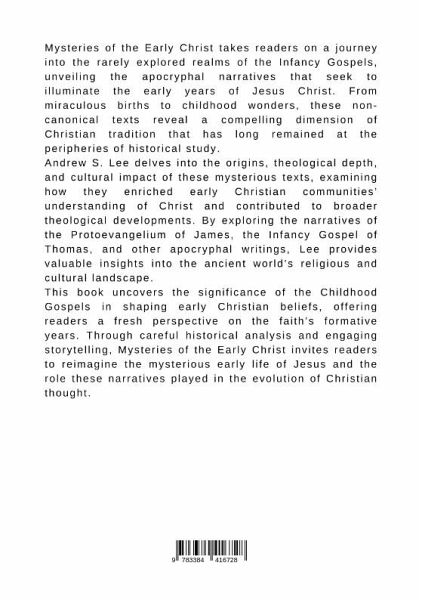 Mysteries of the Early Christ takes readers on a journey into the rarely explored realms of the Infancy Gospels, unveiling the apocryphal narratives that seek to illuminate the early years of Jesus Christ. From miraculous births to childhood wonders, these non-canonical texts reveal a compelling dimension of Christian tradition that has long remained at the peripheries of historical study.Andrew S. Lee delves into the origins, theological depth, and cultural impact of these mysterious texts, examining how they enriched early Christian communities' understanding of Christ and contributed to broader theological developments. By exploring the narratives of the Protoevangelium of James, the Infancy Gospel of Thomas, and other apocryphal writings, Lee provides valuable insights into the ancient world's religious and cultural landscape.This book uncovers the significance of the Childhood Gospels in shaping early Christian beliefs, offering readers a fresh perspective on the faith's formative years. Through careful historical analysis and engaging storytelling, Mysteries of the Early Christ invites readers to reimagine the mysterious early life of Jesus and the role these narratives played in the evolution of Christian thought.