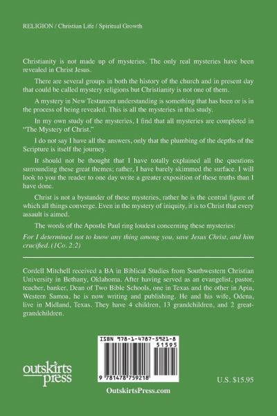 Christianity is not made up of mysteries. The only real mysteries have been revealed in Christ Jesus. There are several groups in both the history of the church and in present day that could be called mystery religions but Christianity is not one of them. A mystery in New Testament understanding is something that has been or is in the process of being revealed. This is all the mysteries in this study. In my own study of the mysteries, I find that all mysteries are completed in "The Mystery of Christ." I do not say I have all the answers, only that the plumbing of the depths of the Scripture is itself the journey. It should not be thought that I have totally explained all the questions surrounding these great themes; rather, I have barely skimmed the surface. I will look to you the reader to one day write a greater exposition of these truths than I have done. Christ is not a bystander of these mysteries, rather he is the central figure of which all things converge. Even in the mystery of iniquity, it is to Christ that every assault is aimed. The words of the Apostle Paul ring loudest concerning these mysteries: For I determined not to know any thing among you, save Jesus Christ, and him crucified. (1Co. 2:2)