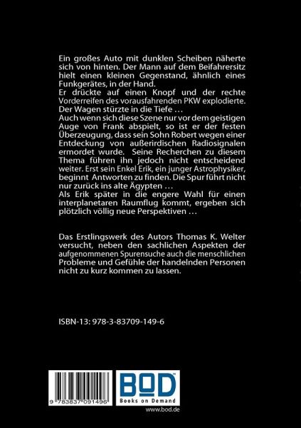 Ein großes Auto mit dunklen Scheiben näherte sich von hinten. Der Mann auf dem Beifahrersitz hielt einen kleinen Gegenstand, ähnlich eines Funkgerätes, in der Hand. Er drückte auf einen Knopf und der rechte Vorderreifen des vorausfahrenden PKW explodierte. Der Wagen stürzte in die Tiefe ...Auch wenn sich diese Szene nur vor dem geistigen Auge von Frank abspielt, so ist er der festen Überzeugung, dass sein Sohn Robert wegen einer Entdeckung von außerirdischen Radiosignalen ermordet wurde. Seine Recherchen zu diesem Thema führen ihn jedoch nicht entscheidend weiter. Erst sein Enkel Erik, ein junger Astrophysiker, beginnt erste Antworten zu finden. Die Spur führt nicht nur zurück ins alte Ägypten...Als Erik später in die engere Wahl für einen interplanetaren Raumflug kommt, ergeben sich plötzlich völlig neue Perspektiven....Das Erstlingswerk des Autors Thomas K. Welter versucht, neben den sachlichen Aspekten der aufgenommenen Spurensuche auch die menschlichen Probleme und Gefühleder handelnden Personen nicht zu kurz kommen zu lassen.