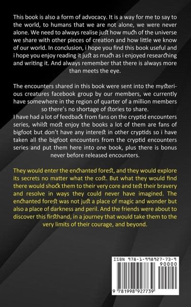 This book is also a form of advocacy. It is a way for me to say to the world, to humans that we are not alone, we were never alone. We need to always realise just how much of the universe we share with other pieces of creation and how little we know of our world. In conclusion, i hope you find this book useful and i hope you enjoy reading it just as much as i enjoyed researching and writing it. And always remember that there is always more than meets the eye. Welcome to mysterious creatures: cryptid encounters bigfoot special. The encounters shared in this book were sent into the mysterious creatures facebook group by our members, we currently have somewhere in the region of quarter of a million members so there's no shortage of stories to share. I have had a lot of feedback from fans on the cryptid encounters series, whilst most enjoy the books a lot of them are fans of bigfoot but don't have any interest in other cryptids so i have taken all the bigfoot encounters from the cryptid encounters series and put them here into one book, plus there is bonus never before released encounters. They would enter the enchanted forest, and they would explore its secrets no matter what the cost. But what they would find there would shock them to their very core and test their bravery and resolve in ways they could never have imagined. The enchanted forest was not just a place of magic and wonder but also a place of darkness and peril. And the friends were about to discover this firsthand, in a journey that would take them to the very limits of their courage, and beyond.