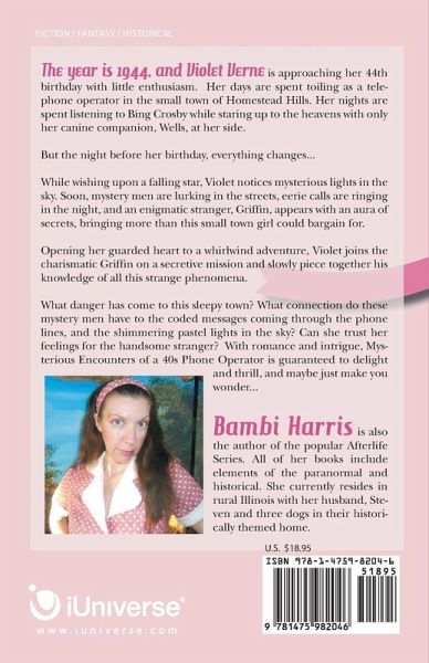 The year is 1944, and Violet Verne is approaching her 44th birthday with little enthusiasm. Her days are spent toiling as a telephone operator in the small town of Homestead Hills. Her nights are spent listening to Bing Crosby while staring up to the heavens with only her canine companion, Wells, at her side. But the night before her birthday, everything changes... While wishing upon a falling star, Violet notices mysterious lights in the sky. Soon, mystery men are lurking in the streets, eerie calls are ringing in the night, and an enigmatic stranger, Griffin, appears with an aura of secrets, bringing more than this small town girl could bargain for. Opening her guarded heart to a whirlwind adventure, Violet joins the charismatic Griffin on a secretive mission and slowly piece together his knowledge of all this strange phenomena. What danger has come to this sleepy town? What connection do these mystery men have to the coded messages coming through the phone lines, and the shimmering pastel lights in the sky? Can she trust her feelings for the handsome stranger? With romance and intrigue, Mysterious Encounters of a 40s Phone Operator is guaranteed to delight and thrill, and maybe just make you wonder...