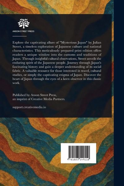 Explore the captivating allure of "Mysterious Japan" by Julian Street, a timeless exploration of Japanese culture and national characteristics. This meticulously prepared print edition offers readers a unique window into the customs and traditions of Japan. Through insightful cultural observations, Street unveils the enduring spirit of the Japanese people. Journey through Japan's fascinating history and gain a deeper understanding of its social fabric. A valuable resource for those interested in travel, cultural studies, or simply the captivating enigma of Japan. Discover the heart of Japan…mehr