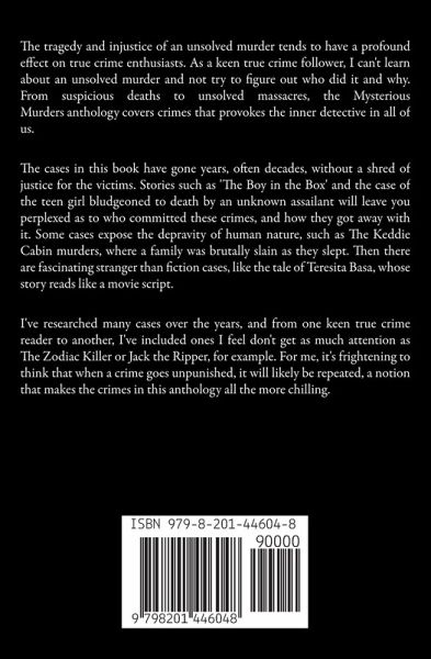 The tragedy and injustice of an unsolved murder tends to have a profound effect on true crime enthusiasts. As a keen true crime follower, I can't learn about an unsolved murder and not try to figure out who did it and why. From suspicious deaths to unsolved massacres, the Mysterious Murders anthology covers crimes that provokes the inner detective in all of us. The cases in this book have gone years, often decades, without a shred of justice for the victims. Stories such as 'The Boy in the Box' and the case of the teen girl bludgeoned to death by an unknown assailant will leave you perplexed as to who committed these crimes, and how they got away with it. Some cases expose the depravity of human nature, such as The Keddie Cabin murders, where a family was brutally slain as they slept. Then there are fascinating, stranger than fiction cases, like the tale of Teresita Basa, whose story reads like a movie script. I've researched many cold cases over the years, and from one keen true crime reader to another, I've included ones I feel don't get as much attention or coverage (like The Zodiac Killer or Jack the Ripper, for example). While some of these cases did hit headlines at the time they happened, it's frustrating to find lack of clues ended up in lack of interest over time. True crime is never the lightest of reads, but the cases in these book are made all the more heavy due to the victims never being granted justice, nor their families closure. It's frightening to think that when a crime goes unpunished, it will likely be repeated, a notion that makes the crimes in this anthology all the more chilling.