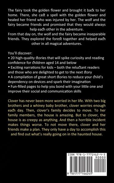 The fairy took the golden flower and brought it back to her home. There, she cast a spell with the golden flower and healed her friend who was injured by her. The wolf and the fairy became friends and promised that they would always help each other in the adventure. From that day on, the wolf and the fairy became inseparable friends. They explored the forest together and helped each other in all magical adventures. You'll discover:20 high-quality stories that will spike curiosity and reading confidence for children aged 14 and below Exciting narrations for kids - both the reluctant readers and those who are delighted to get to the next story A compilation of great short stories to reduce your child's dependency on devices and spark their imagination Fun-filled pages to help you bond with your little one and improve their social and communication skills Clover has never been more worried in her life. With two big brothers and a whiney baby brother, clover worries enough each day. Then, clover's family decides to move. To her family members, the house is amazing. But to clover, the house is as creepy as anything. And then a horrible incident makes things worse. To not move there, clover and her friends make a plan. They only have a day to accomplish this and find out what's really going on in the haunted house.