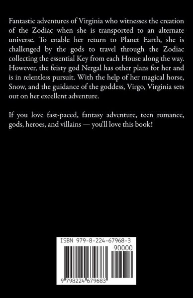 Fantastic adventures of Virginia who witnesses the creation of the Zodiac when she is transported to an alternate universe. To enable her return to Planet Earth, she is challenged by the gods to travel through the Zodiac collecting the essential Key from each House along the way. However, the feisty god Nergal has other plans for her and is in relentless pursuit. With the help of her magical horse, Snow, and the guidance of the goddess, Virgo, Virginia sets out on her excellent adventure. If you love fast-paced, fantasy adventure, teen romance, gods, heroes, and villains - you'll love this book!