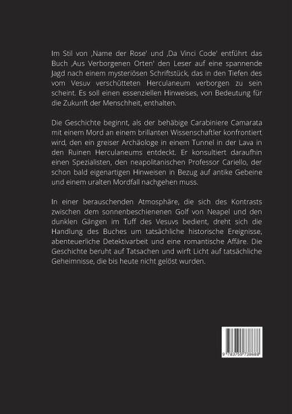 Die antike Stadt Herculaneum liegt halb begraben im Tuffstein, versteckt an den Hängen des Vesuvs im Süden von Neapel. Tief im Inneren, in der Lava, ruht bis heute einer der größten Schätze der Welt - die berühmte Villa der Papyri, deren Arkaden bisher nur teilweise erforscht wurden - durch Tunnel, dreißig Meter unter der Erde...Ein begabter Wissenschaftler wird in einem Gang, der zu dieser Villa führt, erschlagen aufgefunden. Colonel Camarata und Professor Cariello machen sich auf die Suche nach dem Geheimnis seines Todes und einem mysteriösen Manuskript.Am Fuße des Vesuvs, am azurblauen Golf von Neapel und in den dunklen Tunneln der Lava entspinnt sich eine fesselnde und rätselhafte Jagd nach Mördern und Geheimnissen. Ein Thriller, der auf wahren Begebenheiten beruht."Für Archäologie-Fans"."Ein Muss für Liebhaber von Spannung und Geschichte im Stil von 'Da Vinci Code' oder 'Der Name der Rose'.""Ein neues Lieblingsbuch für Fans von Italien und der Wärme des Südens. Sehr gut recherchiert, spannend und wundervoll beschrieben.""Eines der besten Bücher der letzten Zeit."
