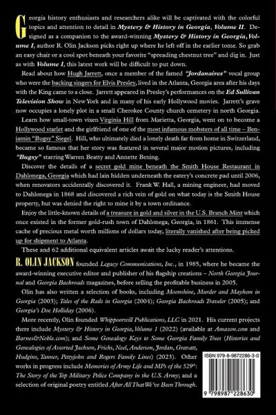 Georgia history enthusiasts and researchers alike will be captivated with the colorful topics and attention to detail of the many subjects in Mystery & History in Georgia, Volume II. Designed as a companion to the award-winning Mystery & History in Georgia, Volume I, author R. Olin Jackson picks right up where he left off in the earlier tome. So grab an easy chair or cool spot beneath your favorite "spreading chestnut tree" and dig in. Just as with Volume I, this latest work will be difficult to put down. Read about how Hugh Jarrett, who was once a member of the famed "Jordanaires" vocal group, who were the backing singers for Elvis Presley, lived in the Atlanta, Georgia area after his days with the King came to a close. Jarrett appeared in Presley's performances on the Ed Sullivan Television Show in New York and in many of his early Hollywood movies. Jarrett's grave now occupies a lonely plot at a small Cherokee County church in north Georgia. Learn how small-town vixen Virginia Hill from Marietta, Georgia, went on to become a Hollywood starlet and the girlfriend of one of the most famous mobsters of all time - Benjamin "Bugsy" Siegel. Hill, who ultimately died a lonely death far from home in Switzerland, became so famous that her story was featured in several major motion pictures, including "Bugsy" starring Warren Beatty and Annette Bening. Discover the details of a secret gold mine beneath the floor of the Smith House Restaurant in Dahlonega, Georgia which had lain hidden beneath the eatery's concrete pad until 2006, when renovators accidentally discovered it. Frank W. Hall, a mining engineer, had moved to Dahlonega in 1868 and discovered a rich vein of gold on what today is the Smith House property, but was denied the right to mine it by a town ordinance. Enjoy the little-known details of a treasure in gold and silver in the U.S. Branch Mint which once existed in the former gold-rush town of Dahlonega, Georgia, in 1861. This immense cache of precious metal worth millions of dollars today, literally vanished after being picked up for shipment to Atlanta. These and 62 additional equivalent articles await the lucky reader's attentions.