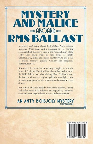 A 1920s cosy aboard a yacht on the Scilly Seas Golden-age gadabout Anty Boisjoly, his valet Vickers, the weary and wary Inspector Wittersham, and a passenger list of howling eccentrics find themselves prey to the sway and spray of the Scilly Seas when what at first seems a simple, unexplainable, locked-stateroom murder twists into a tale of pirate treasure, perilous weather and treacherous endeavours at sea. Just as with all Anty Boisjoly stand-alone stumpers, Mystery and Malice aboard RMS Ballast is best enjoyed by those who can stand some slight silliness in their maritime mysteries. Anty Boisjoly Mysteries are old-school, clean and cosy, locked-room mysteries with improbable plots inspired by Agatha Christie written in the style of an homage to PG Wodehouse.