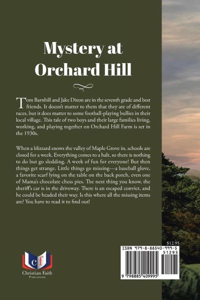 Tom Barnhill and Jake Dixon are in the seventh grade and best friends. It doesn't matter to them that they are of different races, but it does matter to some football-playing bullies in their local village. This tale of two boys and their large families living, working, and playing together on Orchard Hill Farm is set in the 1930s. When a blizzard snows the valley of Maple Grove in, schools are closed for a week. Everything comes to a halt, so there is nothing to do but go sledding. A week of fun for everyone! But then things get strange. Little things go missing--a baseball glove, a favorite scarf lying on the table on the back porch, even one of Mama's chocolate chess pies. The next thing you know, the sheriff's car is in the driveway. There is an escaped convict, and he could be headed their way. Is this where all the missing items are? You have to read it to find out!