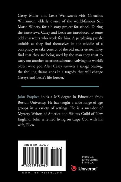 Casey Miller and Lexie Wentworth visit Cornelius Williamson, elderly owner of the world-famous Salt Marsh Winery, for a history project for school. During the interviews, Casey and Lexie are introduced to some odd characters who work for him. A perplexing puzzle unfolds as they find themselves in the middle of a conspiracy to take control of the old man's estate. They find that they are being used by the man they trust to carry out another nefarious scheme involving the world's oldest wine pot. After Casey survives a savage beating, the thrilling drama ends in a tragedy that will change Casey's and Lexie's life forever.