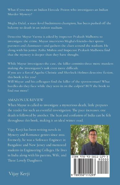 What if you meet an Indian Hercule Poirot who investigates an Indian Murder Mystery? Megha Dalal, a state-level badminton champion, has been pushed off the balcony to death in an indoor stadium. Detective Mayur Varma is asked by inspector Prakash Malhotra to investigate the crime. Mayur interviews Megha's friends-her sports partners and classmates-and gathers the clues around the stadium. He along with his junior Aisha Mishra and Inspector Prakash Malhotra find that the mystery is deeper than they have thought. Mayur understands Megha's fiance, Deepak, is interested to marry his girlfriend. Megha's coach Indranil and her sports partner, Bhuvan are unhappy because Megha refused to romance them. Megha's classmate, Himanshu, holds a grudge against Megha as her father suspended him from college because Himanshu cheated in the exams. Her female sports partner, Kamini, is frustrated as Megha won the titles most of the time. While Mayur investigates the case, the killer commits three more murders making the investigator's task even more difficult. If you are a fan of Agatha Christie and Sherlock Holmes detective fiction, this book is for you! Will Mayur and his colleagues find the killer of the sportswoman? What hurdles do they face while they zero in on the culprit? Click the BUY button to find out more!