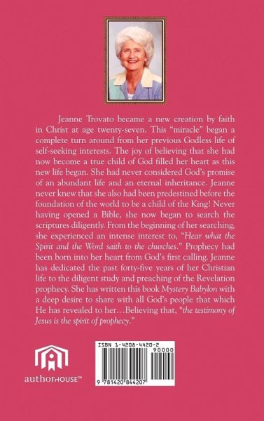 The author, Jeanne Trovato writes to reveal the mystery that is recorded in the last book of the Bible called, 'The Revelation of Jesus Christ.' The ultimate focus of this prophecy is the vision, which the apostle John received and writes about. This graphic description is recorded in the seventeenth chapter of Revelation. 'I saw the woman sit upon a scarlet coloured beast, full of names of blasphemy, having seven heads and ten horns. And the woman was arrayed in purple and scarlet colour, and decked with gold and precious stones and pearls, having a golden cup in her hand full of abominations and filthiness of her fornication: And upon forehead was a name written, MYSTERY BABYLON THE GREAT THE MOTHER OF HARLOTS AND THE ABOMINATIONS OF THE EARTH.' Who is She? Where is Her place in the scheme of prophetic events? The mystery unfolds, as the author presents the many symbolic visions throughout the book of Revelation. As the angel spoke these words to John saying--'Come hither; I will shew unto thee the judgement of the great whore that sitteth upon many waters,' so the author promises to do the same through this prophetic book called, Mystery Babylon.