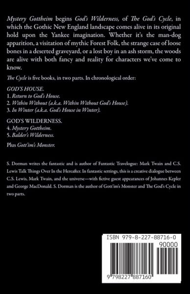 Mystery Gottheim begins God's Wilderness, fourth book of The God's Cycle, in which the Gothic New England landscape comes alive in its original hold upon the yankee imagination. Whether it's the man-dog apparition, a visitation of mythic Forest Folk, or the strange case of loose bones in a deserted graveyard, or lost boy in an ash storm, the woods are alive with both fancy and reality for characters we've come to know. The cycle is five books, in two parts. In chronological order: GOD'S HOUSE. 1. Return to God's House. 2. Within Without (a.k.a. Within Without God's House). 3. In Winter (a.k.a. God's House in Winter). GOD'S WILDERNESS. 4. Mystery Gottheim. 5. Balder's Wilderness. Plus Gott'im's Monster.