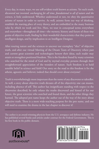 Every day, in many ways, we use self-evident truth known as axioms. Yet such truth, discovered not invented, unchanging for all time, foundational to all of nature and the sciences, is little understood. Whether understood or not, we obey the quantitative axioms of nature in order to survive. As well, axioms form our way of thinking, establish the starting place of every theory, and are embedded in the many business rules by which we work and live. Here, we tour in conceptual terms everywhere and everywhen-throughout all time-the mystery, history and future of these tiny grains of objective truth, finding by their wonderful characteristics that they point to intelligent design, and by implication to an Intelligent Designer. After touring nature and the sciences to uncover our exemplary "slice" of objective truth, and after our virtual Meeting of the Dream Team of Discovery where past and current great scientists and technologists bestow their ideas, each reader may attain or strengthen positional freedom. This is the freedom found by many scientists who searched for the mind of God and by myriad everyday persons through their straightforward appreciation of the wonders of nature. Such freedom is to hold sensible belief in science and faith! Our story on the road to this freedom is for the atheist, agnostic and believer; indeed that should cover about everyone! Truth is overwhelmingly more important than the name of any discoverer or taleteller. As well, a story about objective truth dictates all of the objectivity one can muster, including absence of self. This author has insignificant standing with respect to the discoveries described; he only relates the truths discovered and hinted of for our future, the great scientists who searched and found them, and the other things they learned. The adopted pen name keeps the author out of the way of the story about objective truth. There is a more wide-reaching purpose for the pen name, and one will need to examine the