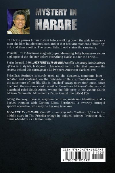 Mystery in Harare is the second installment in the Priscilla trilogy-turned-series. The bride pauses for an instant before walking down the aisle to marry a man she likes but does not love, and in that hesitant moment, a shot rings out, and then another. The groom falls. Blood stains the sanctuary. Priscilla J. "PJ" Austin, a magnetic, up-and-coming baby boomer, catches a glimpse of the shooter before everything blacks out for the bride... Set in the mid1980s, Mystery in Harare Priscilla's Journey into Southern Africa is a stylish, fast-paced, character-driven thriller that unravels the secrets behind this carnage at a Midwestern American Black church. Along the way, there is mayhem, murder, mistaken identities, and a barbed reunion with a swarthy, intrepid, special operative, who may be her one true love. Priscilla has little choice but to learn how to fend for herself in places and ways she never imagined. For sure, she never envisioned herself on the run from assassins in early post-apartheid Zimbabwe and apartheid-ruled South Africa.