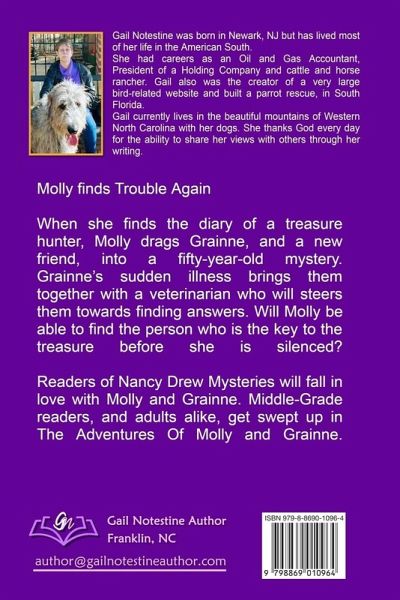 Molly finds Trouble Again When she finds the diary of a treasure hunter, Molly drags Grainne, and a new friend, into a fifty-year-old mystery. Grainne's sudden illness brings them together with a veterinarian who will steers them towards finding answers. Will Molly be able to find the person who is the key to the treasure before she is silenced? Readers of Nancy Drew Mysteries will fall in love with Molly and Grainne. Middle- Grade readers, and adults alike, get swept up in The Adventures Of Molly And Grainne.