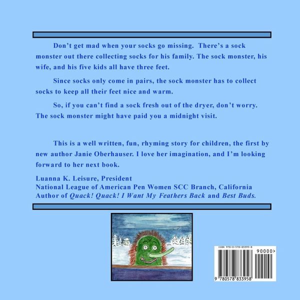 Don't get mad when your socks go missing. Just think, there might be a sock monster who is collecting socks for his family. Mr. Monster has thee legs and so does his family, a Mrs. Monster and five little monsters. Their third foot can't get cold. If you can't find a sock fresh out of the dryer, just remember, Mr. Sock Monster may have paid you a visit. Imagine his family and all those feet toasty warm. Can't get upset over that. This is a well written, fun, rhyming story for children, the first by new author Janie Oberhauser. Looking forward to more.