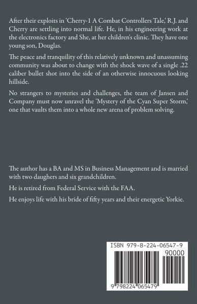 After their exploits in 'Cherry-1 A Combat Controllers Tale,' R.J. and Cherry are settling into normal life. He, in his engineering work at the electronics factory and She, at her children's clinic. They have one young son, Douglas. The peace and tranquility of this relatively unknown and unassuming community was about to change with the shock wave of a single .22 caliber bullet shot into the side of an otherwise innocuous looking hillside. No strangers to mysteries and challenges, the team of Jansen and Company must now unravel the 'Mystery of the Cyan Super Storm,' one that vaults them into a whole new arena of problem solving.