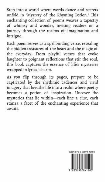 Step into a world where words dance and secrets unfold in "Mystery of the Rhyming Potion." This enchanting collection of poems weaves a tapestry of whimsy and wonder, inviting readers on a journey through the realms of imagination and intrigue. Each poem serves as a spellbinding verse, revealing the hidden treasures of the heart and the magic of the everyday. From playful verses that evoke laughter to poignant reflections that stir the soul, this book captures the essence of life's mysteries wrapped in lyrical charm. As you flip through its pages, prepare to be captivated by the rhythmic cadences and vivid imagery that breathe life into a realm where poetry becomes a potion of inspiration. Uncover the mysteries that lie within-each line a clue, each stanza a facet of the enchanting experience that awaits.