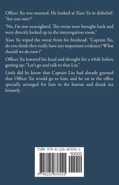 Officer Xu was stunned. He looked at Xiao Yu in disbelief: "Are you sure?" "No, I'm not nearsighted. The twins were brought back and were directly locked up in the interrogation room." Xiao Yu wiped the sweat from his forehead: "Captain Xu, do you think they really have any important evidence? What should we do now?" Officer Xu lowered his head and thought for a while before getting up: "Let's go and talk to that Liu." Little did he know that Captain Liu had already guessed that Officer Xu would go to him, and he sat in the office specially arranged for him in the bureau and drank tea leisurely.