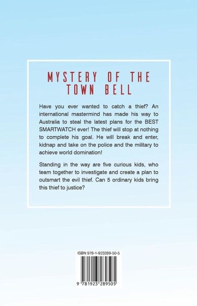 Mystery of the Town Bell Have you ever wanted to catch a thief? An international mastermind has made his way to Australia to steal the latest plans for the BEST SMARTWATCH ever! The thief will stop at nothing to complete his goal. He will break and enter, kidnap and take on the police and the military to achieve world domination! Standing in the way are five curious kids, who team together to investigate and create a plan to outsmart the evil thief. Can 5 ordinary kids bring this thief to justice?
