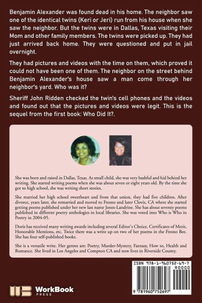 Benjamin Alexander was found dead in his home. The neighbor saw one of the identical twins (Keri or Jeri) run from his house when she saw the neighbor. But the twins were in Dallas, Texas visiting their Mom and other family members. The twins were picked up they had just arrived back home. They were questioned and put in jail overnight. They had pictures and videos with the time on them, which proved it could not have been one of them. The neighbor on the street behind Benjamin Alexander's house saw a man come through her neighbor's yard. Who was it looks like the identical twin size? Sheriff John Ridden checked the twin's cell phones and the videos and found out that the pictures and videos were legit. This is the sequel from the first book: Who Did It?.