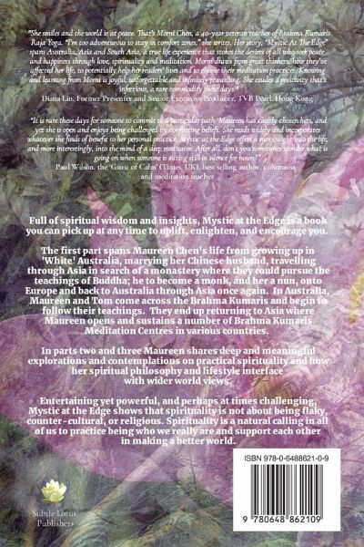 Full of spiritual wisdom and insights, Mystic at the Edge is a book you can pick up at any time to uplift, enlighten, and encourage you. The first part spans Maureen Chen's life from growing up in 'White' Australia, marrying her Chinese husband, travelling through Asia in search of a monastery where they could pursue the teachings of Buddha; he to become a monk, and her a nun, onto Europe and back to Australia through Asia once again. In Australia, Maureen and Tom find a philosophy that suits them. They end up returning to Asia where Maureen opens and sustains a number of meditation centres in various countries. In parts two and three Maureen shares deep and meaningful explorations and contemplations on practical spirituality and how her spiritual philosophy and lifestyle interface with wider world views. Entertaining yet powerful, and perhaps at times challenging, Mystic at the Edge shows that spirituality is not about being flaky, counter-cultural, or religious. Spirituality is a natural calling in all of us to practice being who we really are and support each other in making a better world.