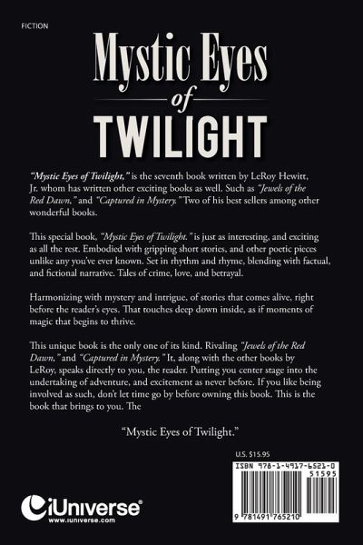 "Mystic Eyes of Twilight," is the seventh book written by LeRoy Hewitt, Jr. whom has written other exciting books as well. Such as "Jewels of the Red Dawn," and "Captured in Mystery." Two of his best sellers among other wonderful books. This special book, "Mystic Eyes of Twilight." is just as interesting, and exciting as all the rest. Embodied with gripping short stories, and other poetic pieces unlike any you've ever known. Set in rhythm and rhyme, blending with factual, and fictional narrative. Tales of crime, love, and betrayal. Harmonizing with mystery and intrigue, of stories that comes alive, right before the reader's eyes. That touches deep down inside, as if moments of magic that begins to thrive. This unique book is the only one of its kind. Rivaling "Jewels of the Red Dawn," and "Captured in Mystery." It, along with the other books by LeRoy, speaks directly to you, the reader. Putting you center stage into the undertaking of adventure, and excitement as never before. If you like being involved as such, don't let time go by before owning this book. This is the book that brings to you. The "Mystic Eyes of Twilight."