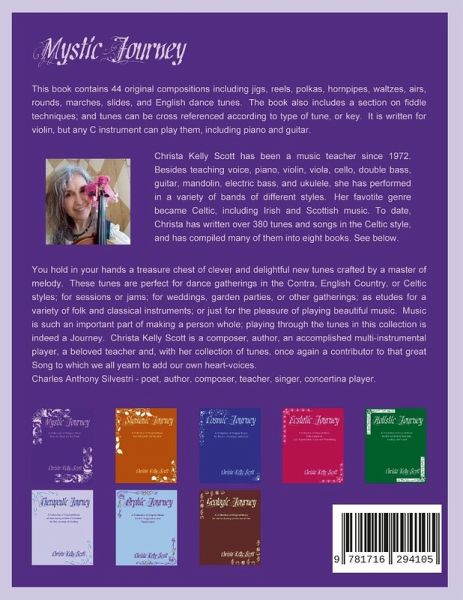 Mystic Journey contains 44 original compositions including jigs, reels, polkas, hornpipes, waltzes, airs, rounds, marches, slides, and dance tunes in the Celtic style for violin (fiddle) or any other C instrument such as flute, penny whistle, concertina, accordion, mandolin, banjo, guitar, or piano. Chord notation is included for accompaniment. It also contains personal inspirations and stories relating to Celtic mythology as well as a few pictures; all surrounded by graphics that could be colored if so desired. The Appendix includes instruction on how to play the Irish fiddle style as well as a breakdown of the tunes in their categories and keys. This is not your ordinary music book. It's a magical experience (journey) for the beginning musician as well as the seasoned professional. Mystic Journey is book #1 of eight books in the series "The Bardic Journeys of Kelawen".